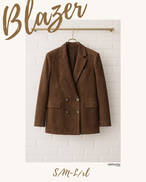 Suavidad aterciopelada y estructura impecable. Nuestra blazer de antelina en tono marrón chocolate tiene caída fluida, doble botonadura, bolsillos con solapa y forro interior para máximo confort. Las hombreras discretas estilizan y suman elegancia a cualquier look (jeans, vestido o sastre).